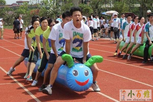 骑在毛毛虫上,手拉拉环,从起点开始大家开始奔跑至终点,